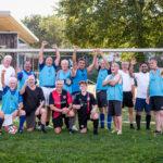 Spielbericht: Volles Haus im Stadion an der Waldstraße, zwei Gästespieler mit Ausnahmespielgenehmigung, herrliches Fußballwetter, grüner saftiger Rasen – der gerne mal wieder von Figo gewalzt werden möchte, und exzellente Mannschaftbilder by Hammer.Es standen sich zwei ausgeglichene Team gegenüber, abgesehen von den Kleinigkeiten, dass Team Bunt in Unterzahl war, gegen die tiefstehende Sonne spielte, einen schwerverletzten Spieler als Torwart aufstellen musste und bergauf spielte. Beide Mannschaften ließen den Ball gekonnt durch die eigenen Reihen laufen, entschieden sich aufgrund der beiderseitigen Spielstärke für eine eher defensive Taktik mit schnellem Umschaltspiel auf die gefährlichen Spitzen und Kurzpassspiel durch die Mitte. Das hochkarätige Spiel endete mit einem Tor Vorsprung für Team Blau und anschließendem Biergelage.