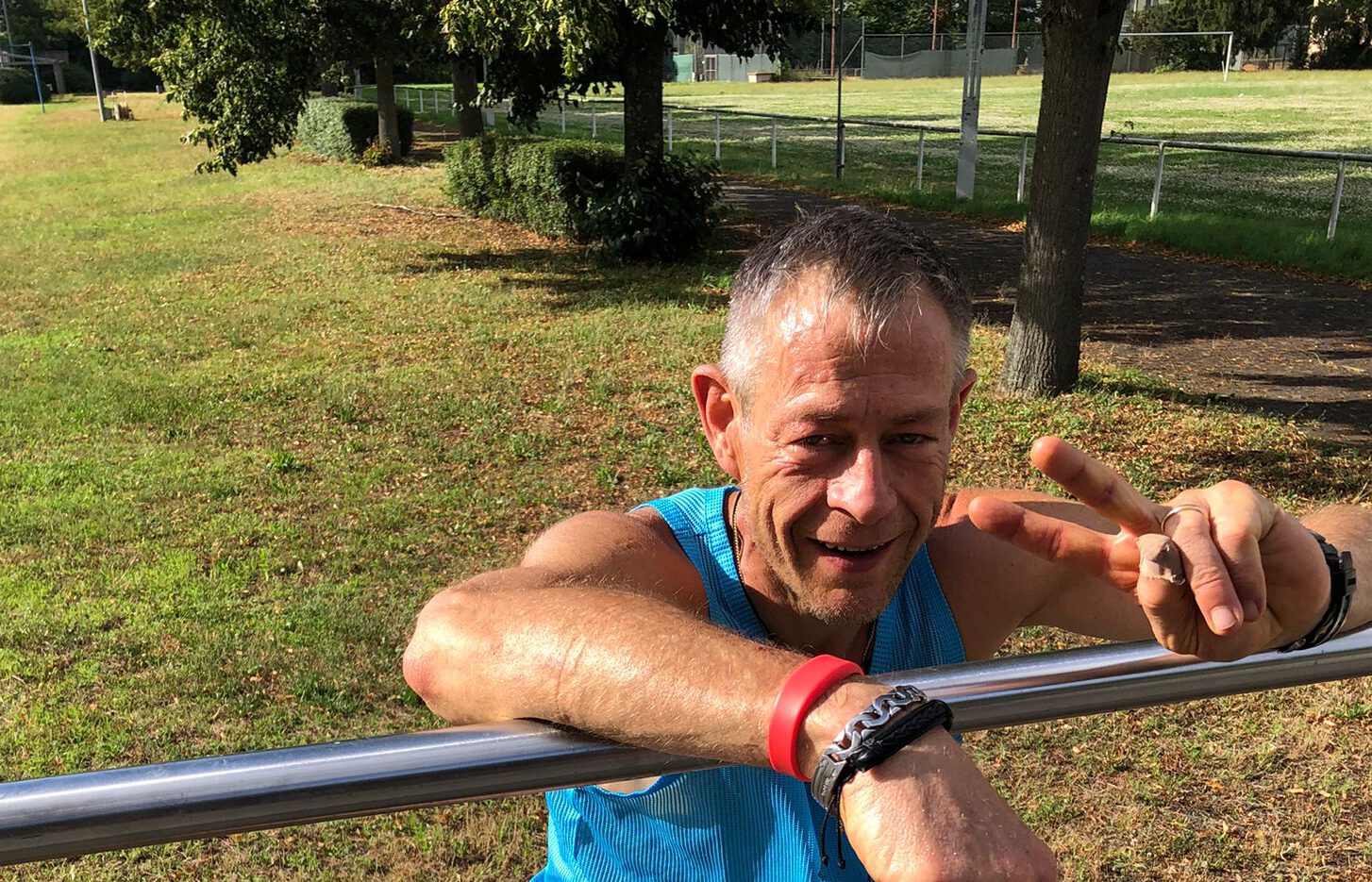 Michael Doppelhüfte spielte mit Klettverschluss am Handgelenk, Ellbogenschonern und Hüftkorsett, lies sich am Torpfosten lauernd anschießen und glänzte mit einem spektakulärem Volley-Tor nach einer Körperdrehung, die nicht zur Nachahmung empfohlen wird. Unser Michael verdient sich mit seinen 13 Toren in beiden Teams den Titel „Mann des Spiels“.