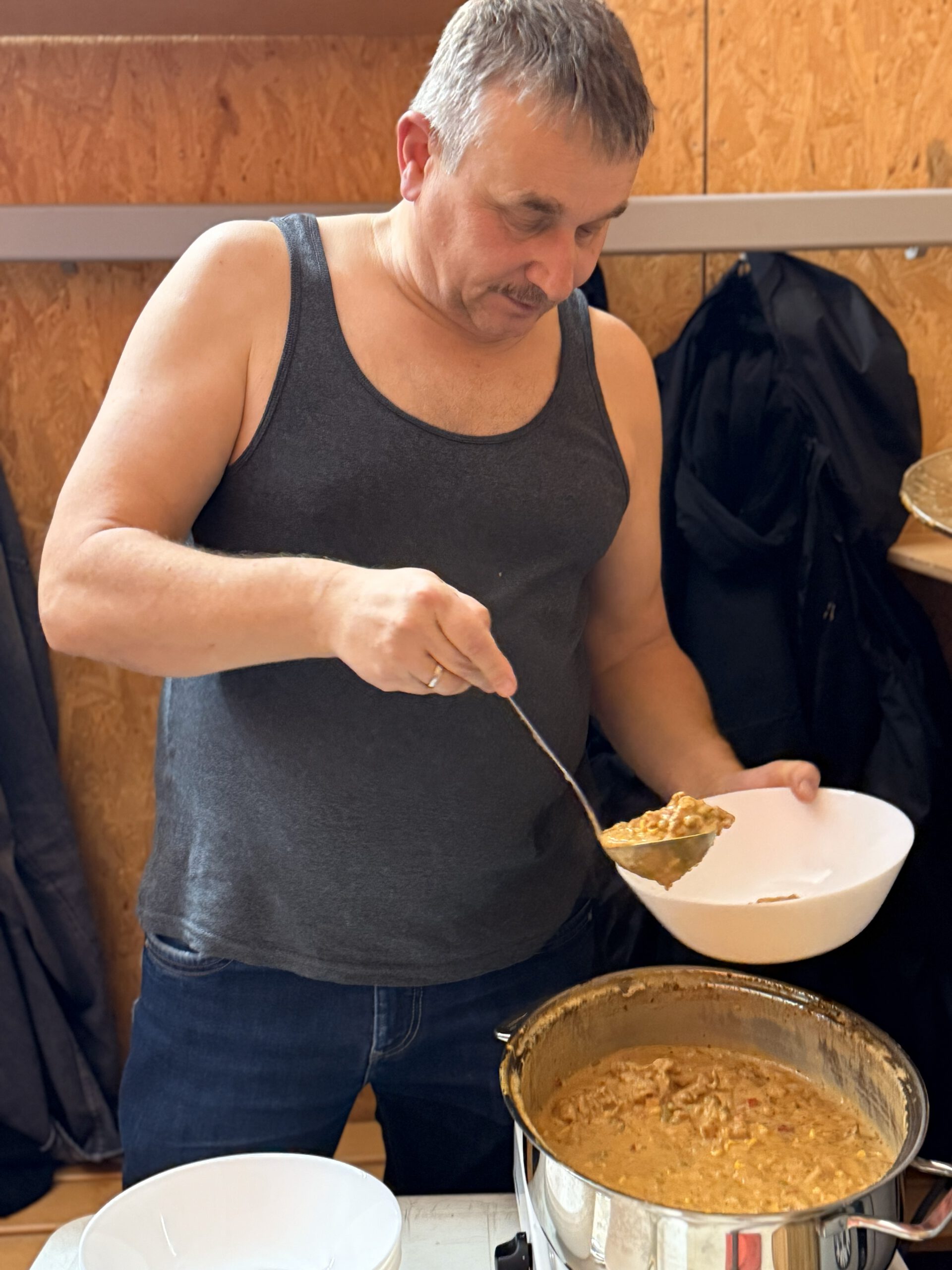 Matthias The Urlauber, sichtlich erleichtert, dass er bei den Freitagskicker das ewige Recht hat den Beinamen „The Urlauber“ zu tragen, verwöhnte die Mannschaft mit dem deftigsten Gulasch-Eintopf in den Annalen der Freitagskicker.