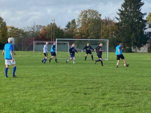 Team Black: MagicMike; Albrecht; Michael Figo; TomTom; Ben The Hämmerchen; Doppelhüfte; Gastspieler Däiwitt.Team Blau: Torwartgott Bernd; Peter uns Overath; Boris The Tank; Matthias The Urlauber; Frankyboy; Martin The Hammer.Rasender Reporter: Del Piero.Liveticker: Beide Mannschaften tasten sich zu Beginn ab, gehen auf Sicherheit und spielen aus einer sicheren Defensive heraus. Es entwickelt sich mit zunehmender Spieldauer ein hochdramatisches Spiel auf höchstem spielerischem Niveau.1:0 Doppelhüfte bewegt seine Hüfte nach links und schiebt den Ball rechts am Torwart vorbei.2:0 Doppelhüfte schlägt wieder zu mit seinem Hüfttrick.Einwechslung von Boris und Gastspieler Däiwitt. Das Spiel nimmt noch mehr an Fahrt auf.2:1 Pep The Urlauber steht goldrichtig vorm Tor und macht die Bude.2:2 The Tank mit wuchtigem Schuss aus der Distanz ins rechte untere Eck.2:3 Martin The Hammer zur Führung nach tollem Solotanz durch die Abwehrreihen.Team Blau presst weiter, erneutes Solo von Martin, kurzes Abspiel zu Boris, doch dieser scheitert am Adler Mike Im Tor.Erneutes Pressing von Team Blau über die rechte Seite mit Pep, flacher Pass quer durch den Sechzehner, aber zu steil für den heranstürmenden Frankyboy.Team Blau mit erneuter Flanke von links, Pep steht beim Kopfball wie Ronaldo in der Luft, Ball wird aber abgeblockt.Krasse Pressingphase der Blauen geht weiter mit einem Strahl von Pep auf Tor von Mike; in letzter Sekunde abgefangen von Däiwitt mit klassischer Grätsche.Martin The Hammer foult sich selbst und bekommt einen klaren Freistoß.Beim Gegenangriff der Blacks kommt der Ball zu Ben. The Hämmerchen setzt den Ball aus 20 Metern mit Schmackes an die Latte.Die Blacks sind super organisiert, es gibt klare und lautstarke Absprachen zwischen Figo und Albrecht.3:3 Doppelhüfte hat schon wieder zugeschlagen aus 30 cm Abstand vom Tor.4:3 Däiwitt nach doppeltem Doppelpass mit Doppelhüfte schiebt den Ball frei vorm Tor ein.Bernd Torwartgott ärgert sich maßlos mit Schaum vorm Mund und den Worten „das gibt´s doch gar nicht, schon wieder ganz frei“.4:4 The Urlauber mit Abspiel über rechts zum freistehenden The Hammer, Schuss flach ins linke Eck unhaltbar für den Adler im Tor.Beide Teams haben umgeschaltet auf Manndeckung über den ganzen Platz. Mal schauen welches Team bei dieser laufintensiven taktischen Variante die meisten Körner lässt.4:5 Boris The Tank schlägt zu – erneute Führung nach Konter über Martin und Pep zu Boris.5:5 Unglaublich – Doppelhüfte erneut erfolgreich 10 cm vorm Tor.Beide Teams gönnen sich eine kleine Atempause. Es sieht aber nicht so aus, als würden sie sich mit einem Unentschieden zufriedengeben. Team Blau greift wieder an; Schuss von Pep – aber Mike liegt quer in der Luft und wehrt die Kugel ab.5:6 Boris mit Flachschuss aus 30 Metern unhaltbar für FlyingMike ins rechte Eck.6:6 Ben The Hämmerchen zum Ausgleich nach Doppelpass mit Doppelhüfte.Die Blacks wehren sich mit allen Mitteln. Bei den Blauen kommt Unruhe auf, leichte Tumulte ob der Nachlässigkeiten im Aufbauspiel.7:6 The Hämmerchen erneuter Torschütze nach Zuckerpass von TomTom.Peter uns Overath spielt gekonnt auf Zeit, um die Blacks aus dem Rhythmus zu bringen.Hartes Foul von The Tank an TomTom; scheinbar gab es einen Körperkontakt.8:6 The Hämmerchen schlägt wieder zu nach sehenswerter Fußballballett-Einlage.Peter uns Overath ruft verzweifelt „Leute, was ein Abspiel, die zwei Mann von uns sind doch gedeckt“.Doppelhüfte vergibt eine 100-prozentige 5 cm vor dem Tor.Albrecht eröffnet in aller Seelenruhe und abgeklärt das Spiel aus der Defence.8:7 Boris The Tank – strammer Schuss ins linke Eck nach Pass von Uns Overath.Erneuter Angriff von Team Blau, doch Peter vergibt mit Schuss über´s Tor. Martin beschwert sich über zu wenig Bälle.Unser Eisenfuß Figo lässt Martin im Zweikampf die Schienbeinschoner spüren.Kontern von Team Blau über Peter, Boris und Martin mit Endstation beim FylingMike.9:7 The Hämmerchen mit strammen Fernschuss. Ist das die Vorentscheidung?Team Blau bäumt sich nochmal auf; Fernschuss durch Frankyboy wird abgeblockt.Däiwitt mit offener Sohle gegen Boris The Tank. Martin will unbedingt den Anschlusstreffer und rackert.9:8 Wahnsinn, Peter mit präzisem Fernschuss ins untere Eck.Ausrufung der Hammer´schen Regel durch The Hammer persönlich.Hohe Flanke von TomTom auf den Kopf von Doppelhüfte, der Ball geht am Tor vorbei; den hätte er wohl mit dem Fuß nehmen müssen.10:8 Doppelhüfte ist der Wahnsinn. Auf der Torlinie macht er das Ding rein zum Doppelsieg (Sieg plus Sieg durch Hammer´sche Regel) von Team Black, trotz Überzahl.