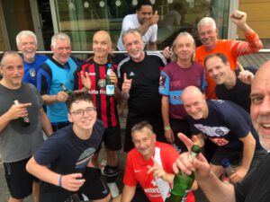 Der Spielverlauf:Team Blau in Überzahl zelebrierte den Tika-Tika-Fußball von uns Overath, ließ über die gesamte Spielzeit das Bällchen durch die eigenen Reihen und kam mit sehenswerten Treffern, u.a. mit vier Hammer-Toren, zum wohlverdienten 8:6 Endstand nach Ausrufung der Hammscher´schen Regel beim Stand von 7:6.Team Bunt in Unterzahl, gab sich über 90 Minuten nie auf und hielt bis zum Schluss den Spielausgang offen, trotz der erhöhten Blutpromille zumindest eines Spielers. Es fehlte aber eindeutig ein weiterer Mann in der Abwehr neben Matthias The Urlauber.