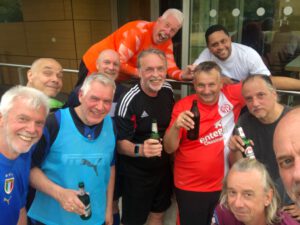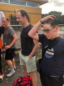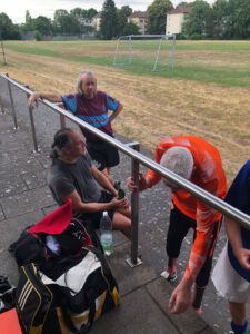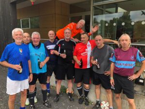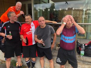 Kurz und knapp – die schonungslose Einzelkritik:Bernd Torwartgott setzte heute alle erlaubten Mittel ein, um seinen Kasten sauber zu halten: Er trug ein Trikot in grellgelben Signalfarben, um seine Giftigkeit zu demonstrieren, und sang permanent und nicht ganz textsicher das Lied von Singapore, um den Gegner zu verwirren.Peter uns Overath strahlte über 90 Minuten über beide Ohren, weil er in seinem Team mehrmals direkte doppelte Doppelpässe spielen konnte und zum Schluss eine Laufleistung von weit über 6 km aufweisen konnte.Thilo hat sein Abschiedsspiel aus seinem Verein vergangene Woche erstaunlich gut verarbeitet und zeigte sich hoch konzentriert und mit gewohnt hoher Laufbereitschaft. Leider musste er auch heute einiges an Härte erfahren und viele Fouls einstecken, da ihm mit anderen Mitteln nicht beizukommen war.Fynn, unser Rackerer in der Abwehr, zeigte ein hervorglänzendes Stellungsspiel und lief den Gegner über die volle Spielzeit konsequent und kompromisslos ab. TomTom konnte ohne Gedanken an die Hertha frei aufspielen und verstand sich blind im Doppelpass-Spiel mit Uns Overath und Thilo. Mit 500 gespielten Pässen und eine Passquote von 99,8 % belegte er in der Statistik direkt den zweiten Platz hinter Peter. Arno führte sein Team mit phänomenaler Abwehrleistung zum Sieg. Und selbstredend hatte er wieder seinen Holzpflock und seine Halskette dabei, um seine linke Abwehrseite zu markieren.Figo hat nun endlich eine Chiropraktikerin mit Erfahrung im Metallbau gefunden, konnte sich diese Woche gradebiegen und gleichzeitig seine angewachsenen Schienbeinschoner ölen lassen. Kampfbereit und mit leichtem Schaum vor dem Mund, musste er jedoch zu Spielbeginn erfahren, dass Boris the Tank abgesagt hatte.The Hammer zeigte heute vier Hammertore: Spannschuss unter die Latte, halbhohe Direktabnahme, Bogenlampe ins Eck und Flachschuss ins lange Eck. Für jeden Geschmack war ein geiles Tor dabei – und dafür gab es den „Man of the match“. Die erfreulichste Nachricht war aber, dass sein Rücken hielt.Matthias the Urlauber – Wächter aller Urlaubszeiten – musste die Abwehr allein zusammenhalten und rannte verzweifelt gegen den One-touch-Fußball des Gegners an. In der dritten Halbzeit konnte er seine erlebte Hilflosigkeit mit einer guten Flasche Becks aufarbeiten.Schorsch wurde mal wieder vor dem Spiel im Hinterzimmer hoch gehandelt, kam aber leicht angeschlagen zum Spiel, war nicht wiederzuerkennen und verließ den Platz als Schlappeseppel; es fehlte ihm heute an seiner allseits gefürchteten Dynamik, Explosivität und Besessenheit auf dem Weg zum Tor.Nils und Jonas, das Brüderpaar, übernahm die Initiative im Mittelfeld, sorgte für den Spielaufbau der Bunten. Jonas glänzte mit einem hervorragenden Torabschluss von der rechten Eckfahne; feinfühlig zirkulierte er den Ball mit viel Drall ins hinter Toreck und ließ unserem Torwartgott keine Chance. Nils erarbeitete sich mehrere Torchancen, ließ diese aber vor Aufregung, freistehend vor dem Kraken, liegen. Pedro Pirouette glänzte, nach zweiwöchiger Erholungsphase auf der Donauinsel in Wien, mit viel Tempo in seinen Bewegungen und unnachahmlichen Körpertäuschungen und Drehungen. Dank seines Engagements blieben die Bunten stets gefährlich und unberechenbar.Boris DAM kam auf den Platz, begrüßte alle Mitspieler mit den Worten „Salud y peseta“ und schien noch ein wenig unsicher im Schritt zu sein; scheinbar musste er noch die vielen Himbi´s aus der Vorwoche verdauen. Del Piero war noch ein wenig müde vom einwöchigen Wasser-Muskelaufbau-Training in südlichen Gefilden und stand noch unter dem Einfluss einer kalorienreichen mediterranen Küche.